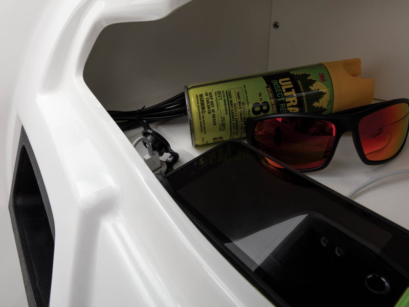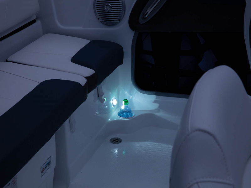 In addition, it has bow lounges, a full-width midship lounge and dual bucket seats. Storage below the lounges, in the deck and inside the engine compartment, among other places, is spacious enough for everyone’s gear (and it’s all finished for easy cleanup).