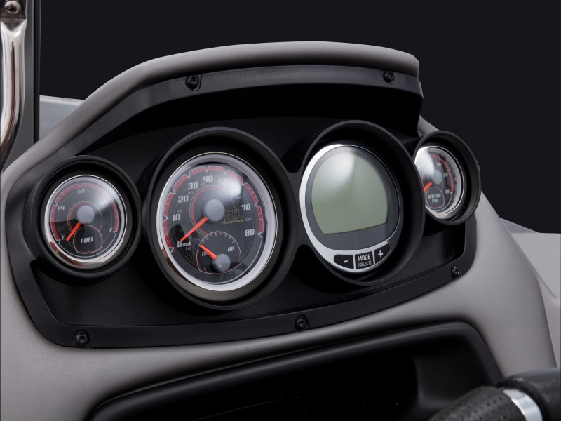 - Console panel with digital switches and custom gauges: position sensing speedometer, tach, fuel, trim, water pressure, volt, clock