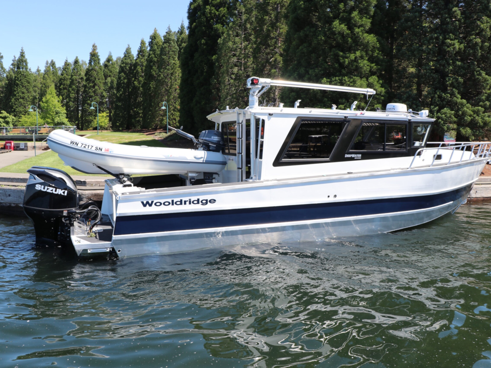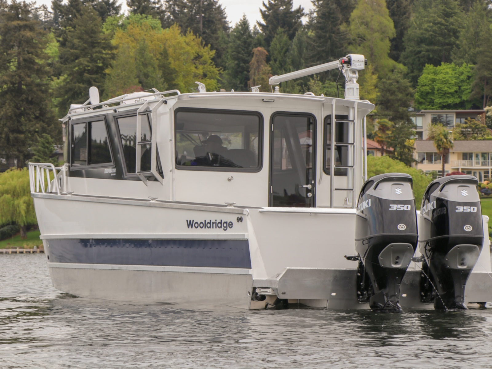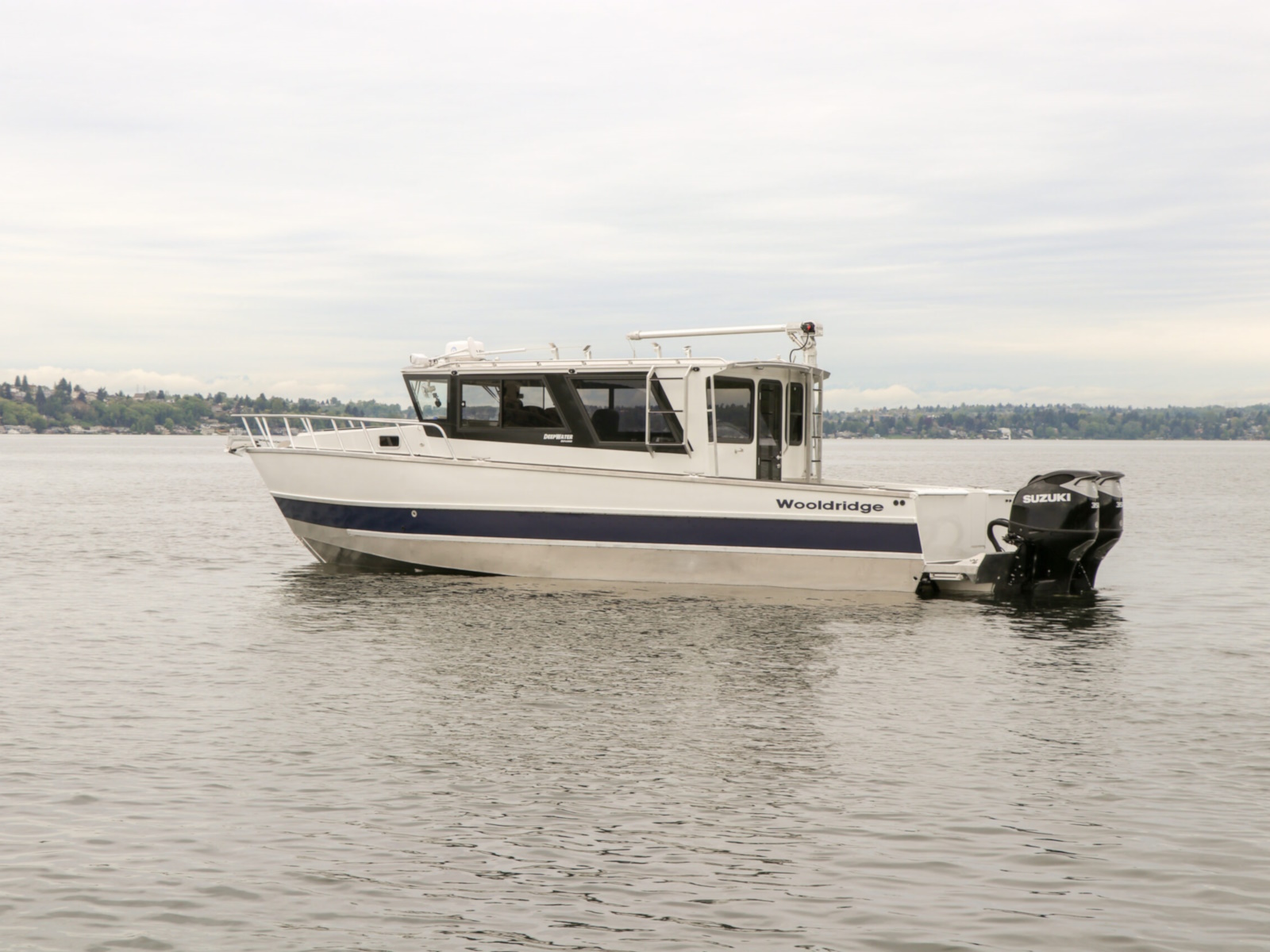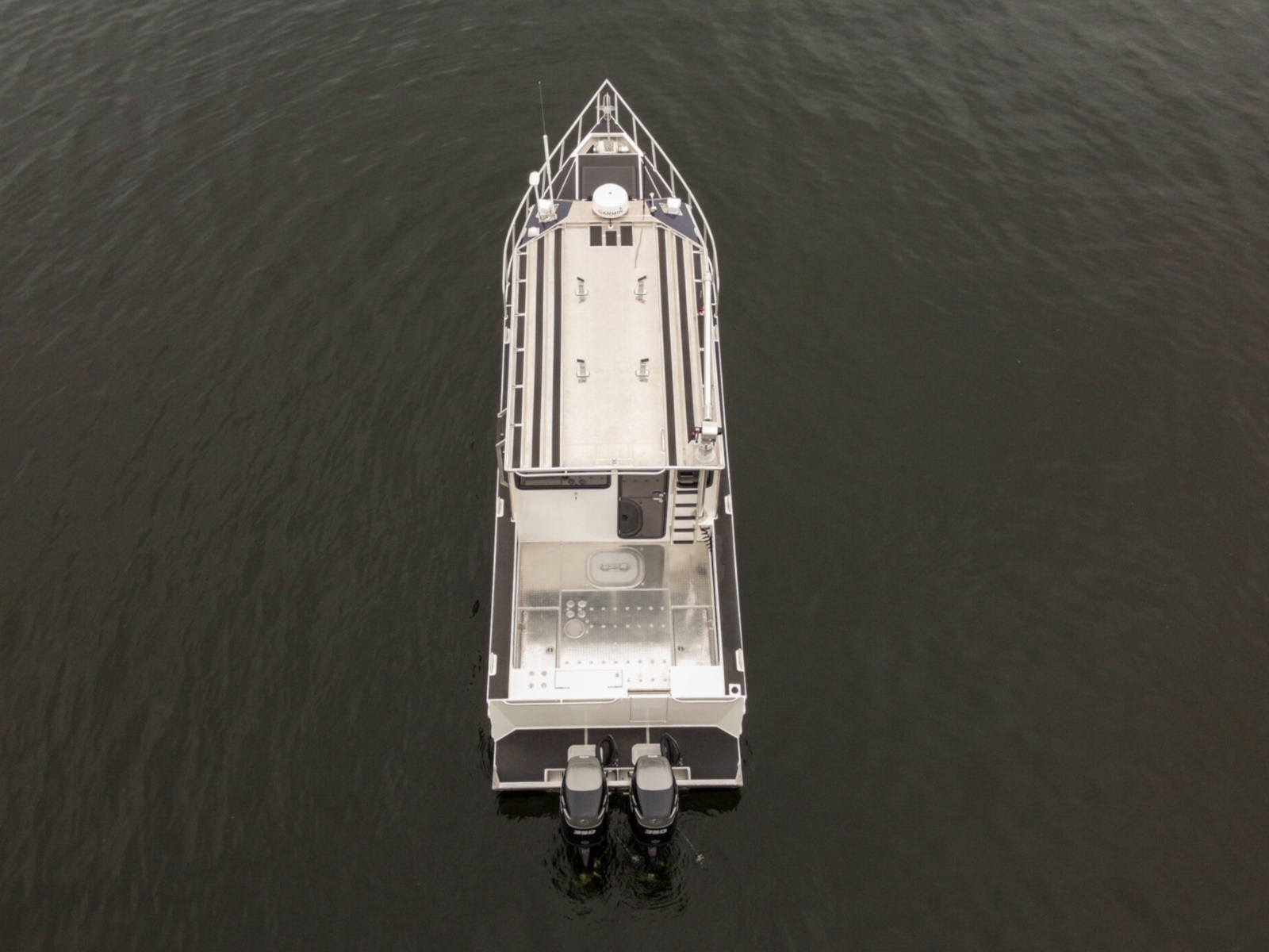 The DeepWater series! Available in three variations, DeepWater Charter, Angler, and Explorer. This boat is the Explorer variant in the series. As you can see we went all out, creating not only an extremely hard working but also beautiful boat for our customers! Two of the new features of this Explorer model we’re excited about, is an spacious belowdecks berth, located at the aft of the cabin, giving even more sleeping and storage space than we’ve previously offered. And second a stand-up head located in the large V-berth, with sink, vanity, and outside facing window. Overhead skylight for plenty of natural light in the main v-berth, it’s hard to get more comfortable. Seating galore with 3 suspension seats for the pilot and copilots, plus dinette seating. Roof mounted davit crane for loading the customers Ridged Inflatable boat, large rear fishing deck, anchor system, and powered by a pair of Suzuki Outboards, this is the ultimate fisher cruiser! But don’t take our word for it, come by our factory and see for yourself!