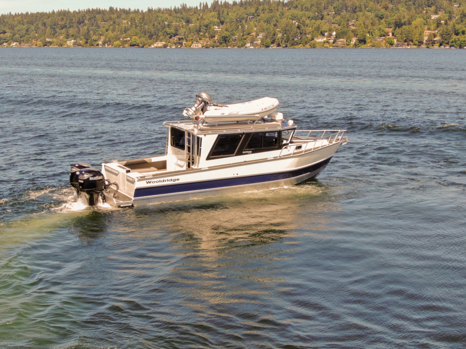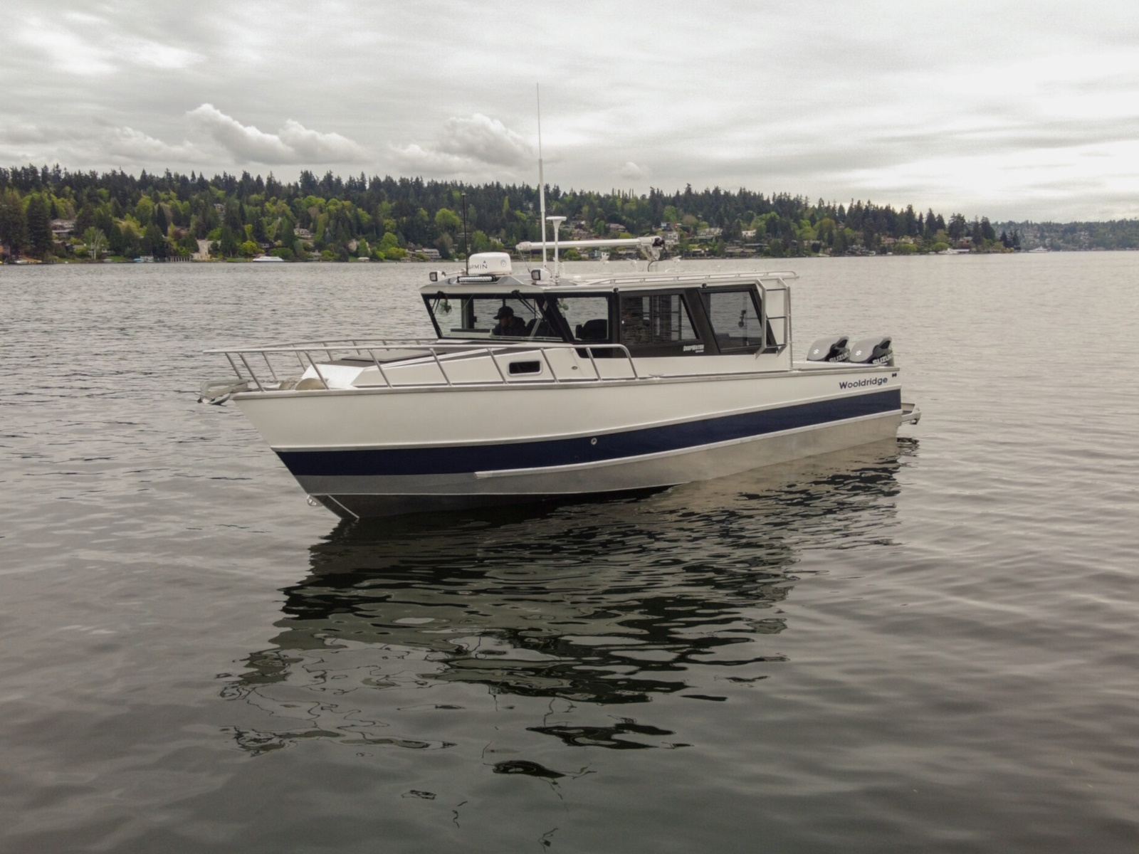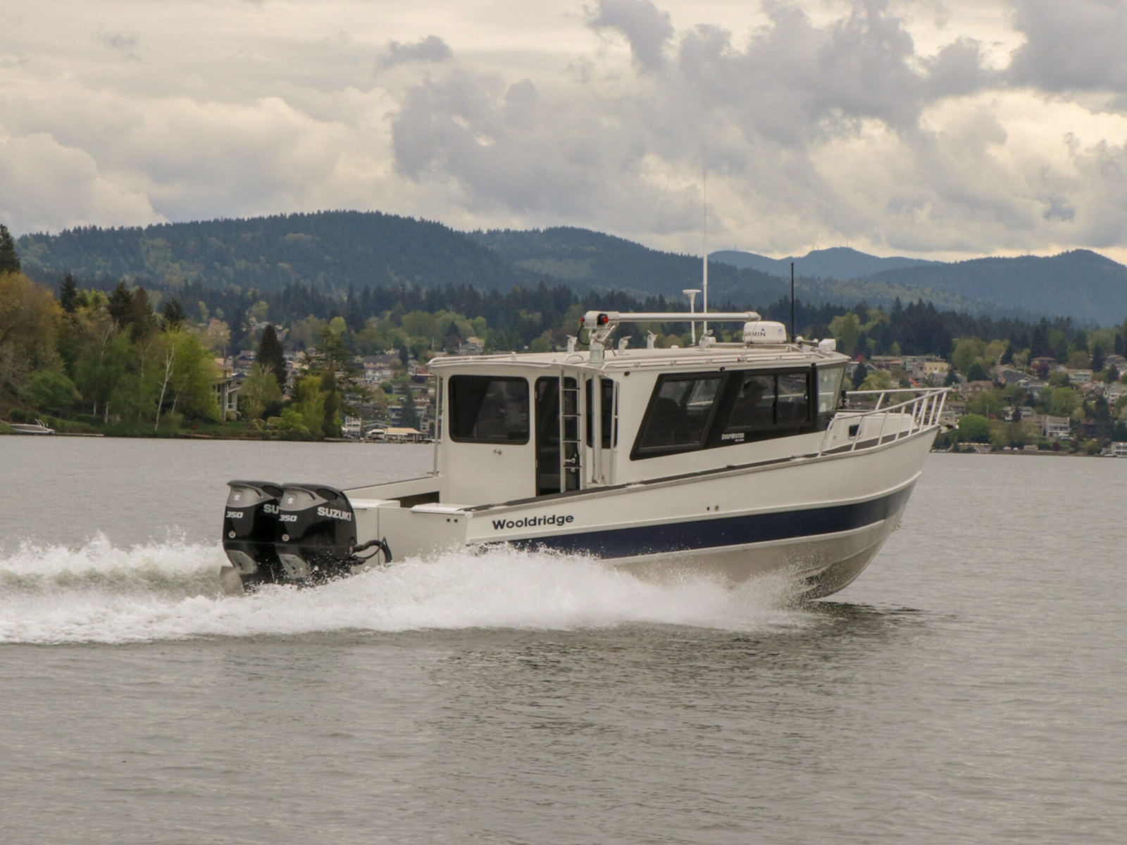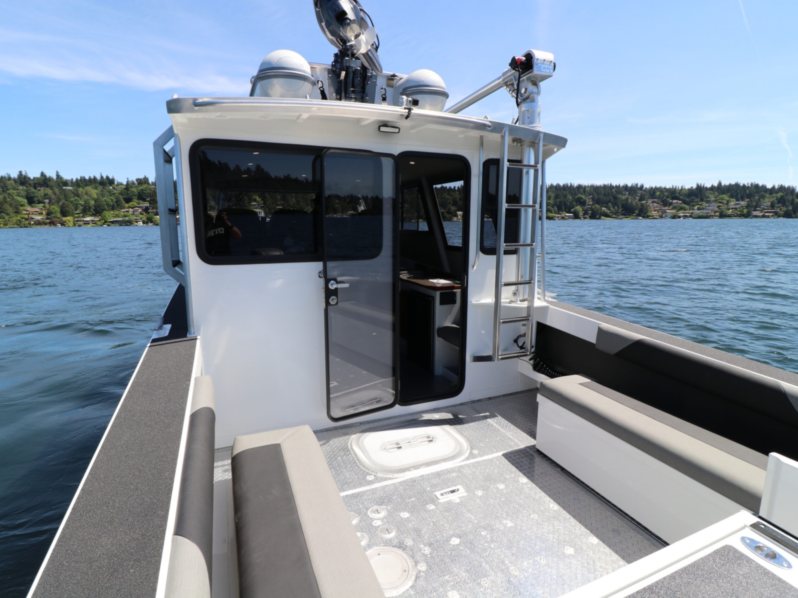 The DeepWater series! Available in three variations, DeepWater Charter, Angler, and Explorer. This boat is the Explorer variant in the series. As you can see we went all out, creating not only an extremely hard working but also beautiful boat for our customers! Two of the new features of this Explorer model we’re excited about, is an spacious belowdecks berth, located at the aft of the cabin, giving even more sleeping and storage space than we’ve previously offered. And second a stand-up head located in the large V-berth, with sink, vanity, and outside facing window. Overhead skylight for plenty of natural light in the main v-berth, it’s hard to get more comfortable. Seating galore with 3 suspension seats for the pilot and copilots, plus dinette seating. Roof mounted davit crane for loading the customers Ridged Inflatable boat, large rear fishing deck, anchor system, and powered by a pair of Suzuki Outboards, this is the ultimate fisher cruiser! But don’t take our word for it, come by our factory and see for yourself!