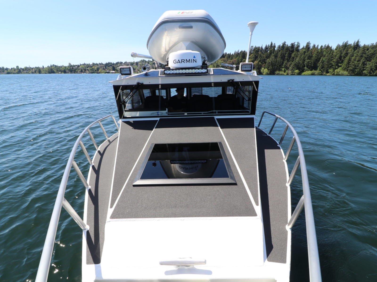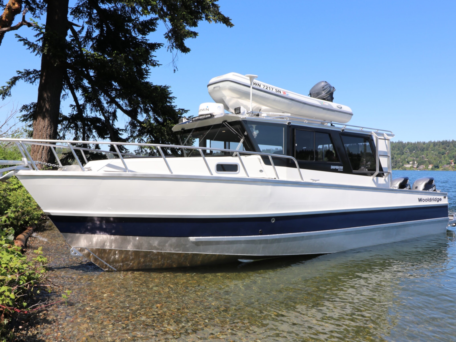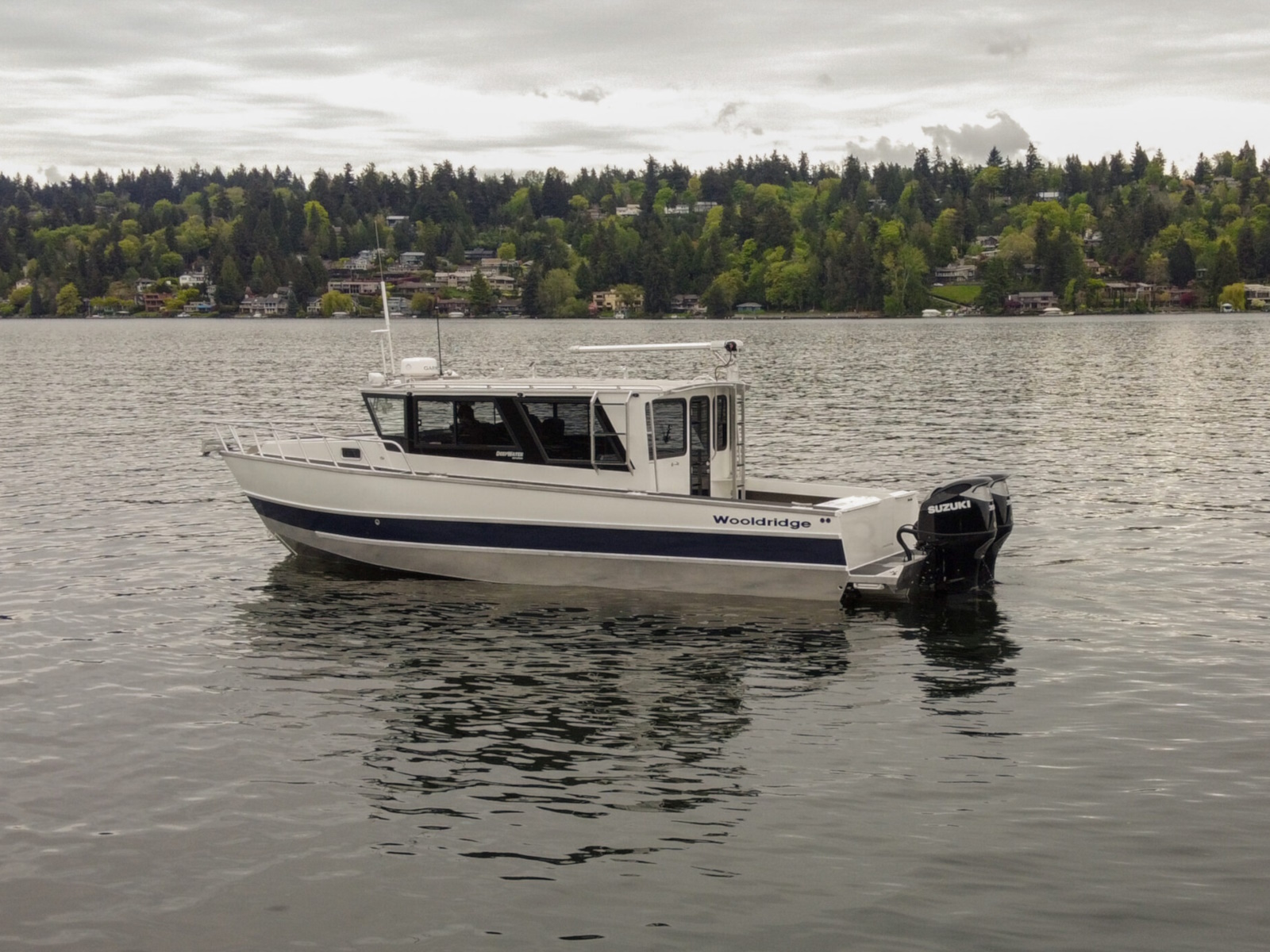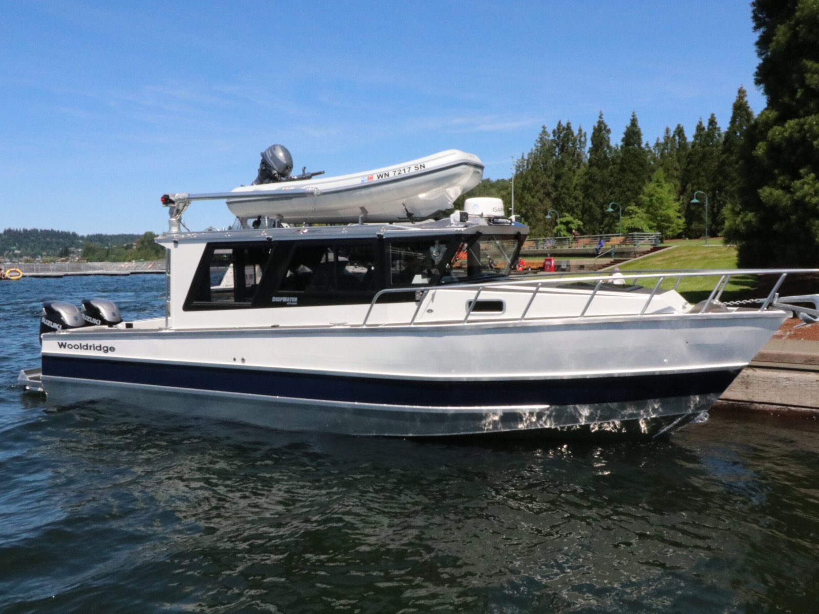 The DeepWater series! Available in three variations, DeepWater Charter, Angler, and Explorer. This boat is the Explorer variant in the series. As you can see we went all out, creating not only an extremely hard working but also beautiful boat for our customers! Two of the new features of this Explorer model we’re excited about, is an spacious belowdecks berth, located at the aft of the cabin, giving even more sleeping and storage space than we’ve previously offered. And second a stand-up head located in the large V-berth, with sink, vanity, and outside facing window. Overhead skylight for plenty of natural light in the main v-berth, it’s hard to get more comfortable. Seating galore with 3 suspension seats for the pilot and copilots, plus dinette seating. Roof mounted davit crane for loading the customers Ridged Inflatable boat, large rear fishing deck, anchor system, and powered by a pair of Suzuki Outboards, this is the ultimate fisher cruiser! But don’t take our word for it, come by our factory and see for yourself!
