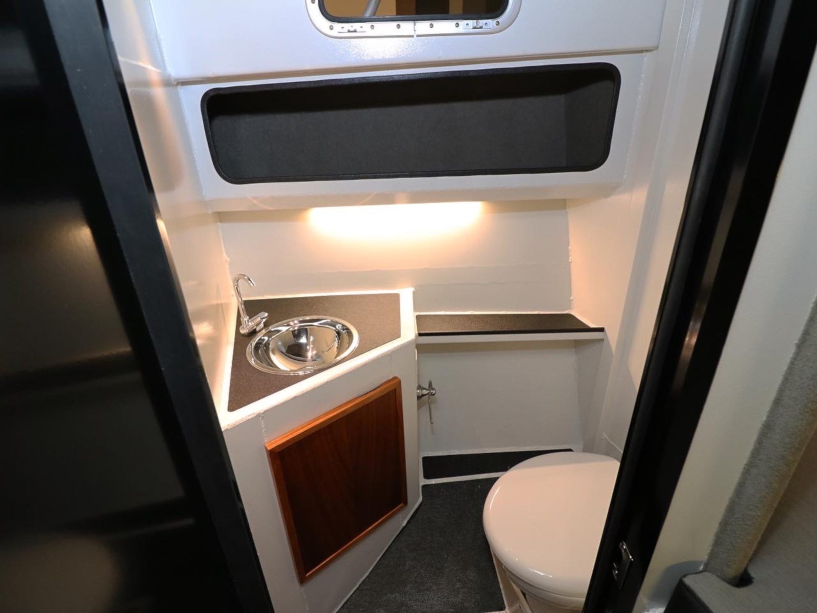 • Head in cuddy w/ 20 gallon holding tank & macerator, locking door, window, small vanity & sink