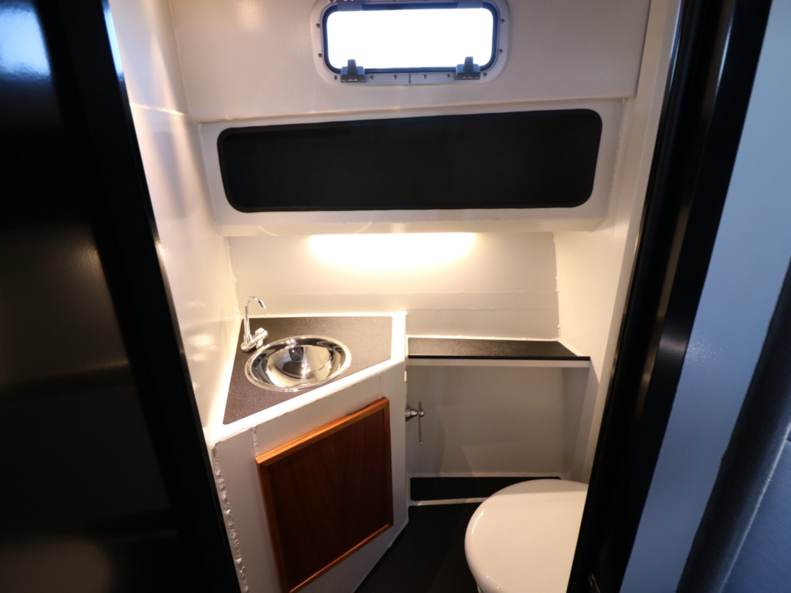 • Head in cuddy w/ 20 gallon holding tank, macerator, locking door, window, small vanity & sink
